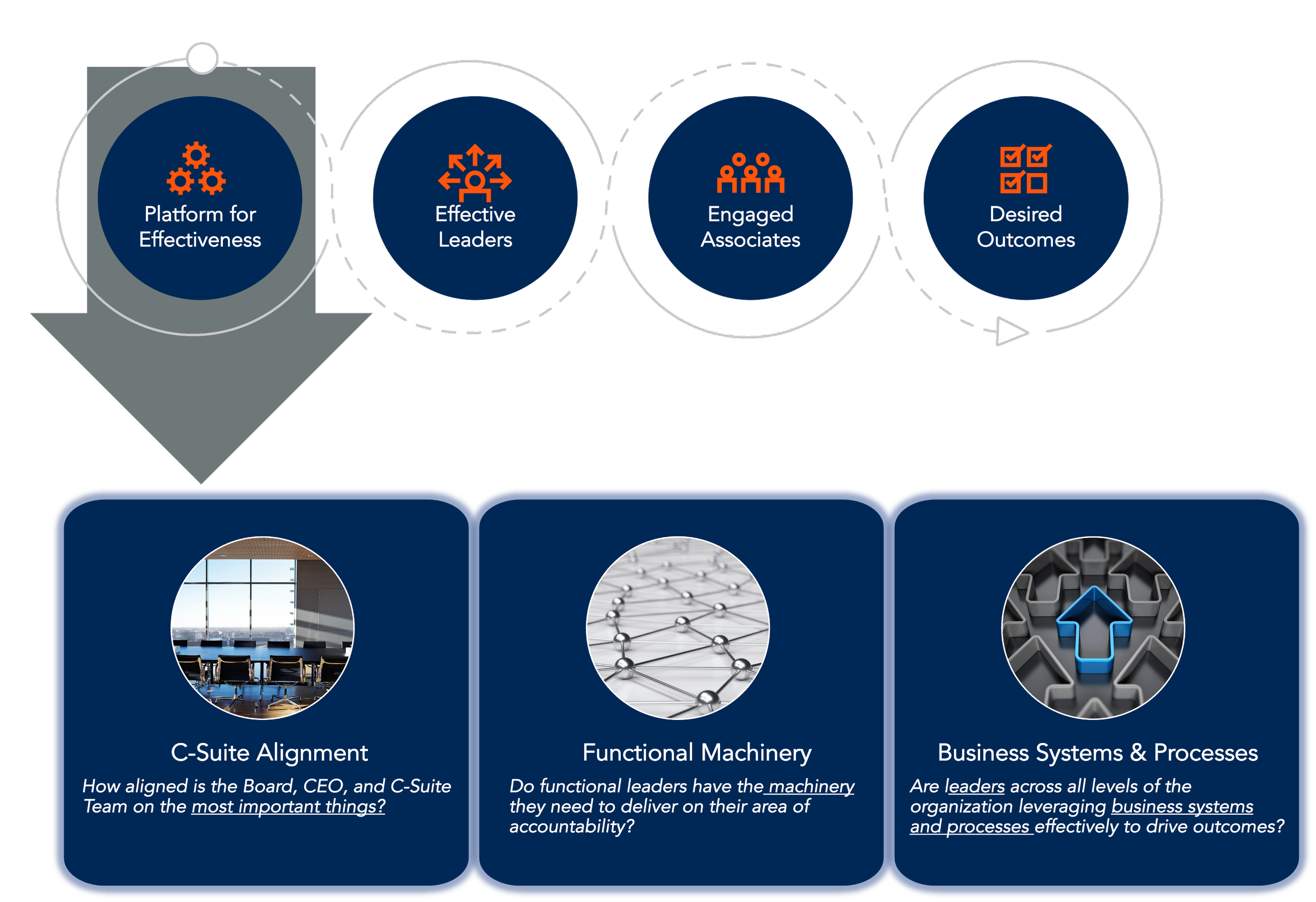 We work with Boards, CEOs, and C-Suite Executives on their roles in providing the Platform of Effectiveness that is the foundation for all that follows. We leverage a proprietary approach, using the “Three-Pillar Assessment Model for Executive Officer Effectiveness”